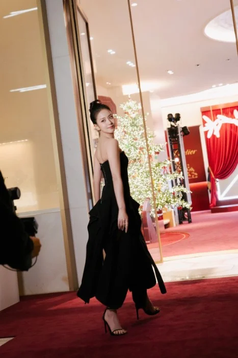 Jisoo stands near a high-top table with two older women. She is wearing a black strapless gown that hugs her figure before flaring into dramatic, asymmetrical ruffles at the hem. The fabric flows like liquid ink, slit high on one leg to reveal a glimpse of toned thigh when she shifts. Her hair is swept into an elegant high bun, a few tendrils framing her face. Gold Cartier earrings catch the light, and a delicate watch glints on her wrist.