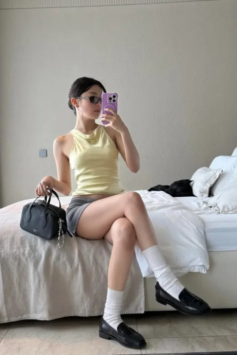 But Sooyoung’s playful expression shifts in an instant. Her eyes narrow as they rake slowly down your body, taking in your bare chest, the light sheen of sweat, the obvious bulge in your boxers, and the faint glistening wetness around your mouth and chin. You can practically see the gears turning in her head.