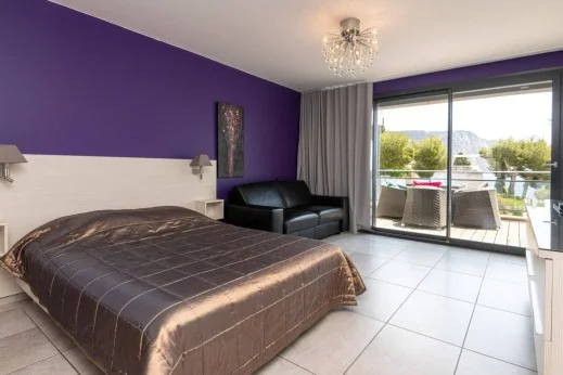 The space is sleek and modern, far more stylish than she’d imagined. The walls are painted a bold, deep violet that somehow works beautifully with the soft gray curtains and light floor tiles. A large, low bed with a silky bronze cover glints softly under the light from a sparkling chandelier overhead. By the wall, a black leather sofa offers a cozy spot to relax, while the sliding glass doors open onto a balcony furnished with rattan chairs and splashes of colorful cushions. Through the glass, Yoona can see the tops of pine trees and, just beyond, the glimmer of the Mediterranean Sea under the fading sunset.