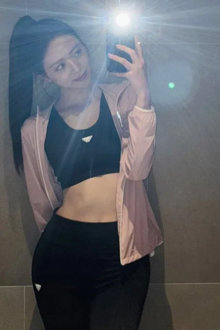 She’s on her yoga mat, moving through a slow stretch with practiced focus. Her hair is pulled into a neat ponytail, the line of her neck clean and exposed. She’s wearing a black sports bra and tight black yoga pants and a thin zip jacket hanging open. Her midriff flexes as she shifts. Her hips roll with easy control. And her ass, wrapped tight in those pants, is right there, framed perfectly as she bends forward, palms flat on the mat.