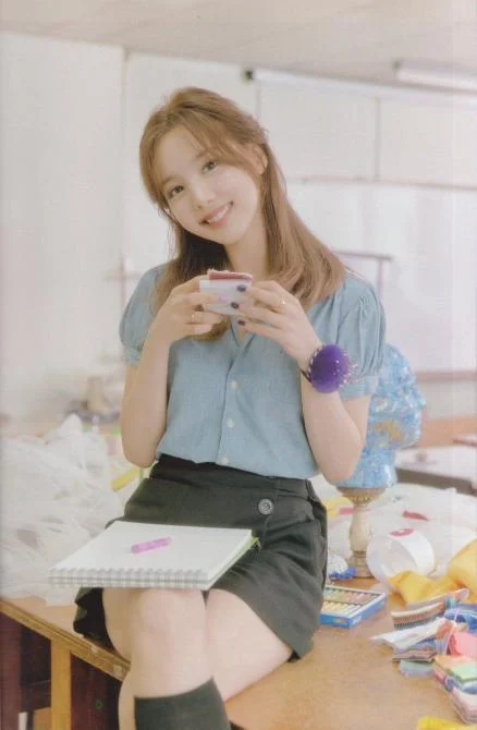 Oh, Im Nayeon. You did a scan of her fashion, since she always looked immaculate. Were those black sneakers? Oh, black knee high socks, a beautiful belted skirt with three buttons to the left, and a light blue blouse. Her centre parted hair was tied up behind her head, the loose strands of hair falling to her clavicles and framing her face. A slight hopeful smile flashed on her face. She looked so pretty.