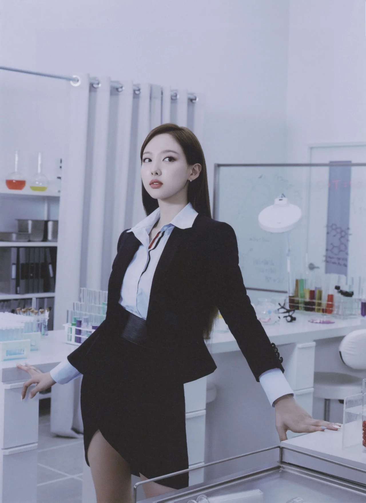 You violently pull at her tucked blouse after breaking the kiss. A hard yank pulls the cloth beneath her belt free, and with a swift motion, you almost tear her blouse open. The rhythmic popping of her buttons being undone in one swoop has Nayeon gasping, and with a shove, both Nayeon’s blazer and blouse fall off her shoulders. Nayeon helps you to pull her upperwear off, then you pull at your own shirt and throw it on the floor on top of Nayeon’s clothing. Both of you are now topless, and Nayeon pounces to pin you against the wall of the lab now, your lips crashing together in another deep kiss, her hands pulling your body flush against hers. You can feel how hard her nipples are against your skin, feel how desperately she wants you to fuck her in her kiss.