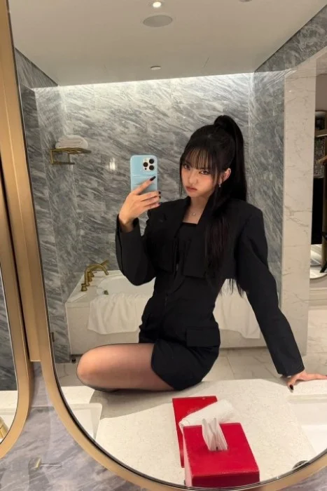 Meanwhile, Sooin changed into her all-black outfit. She fit a black tube with a black stylish blazer on top of it. Black mini skirt at the bottom with sheer black stockings.