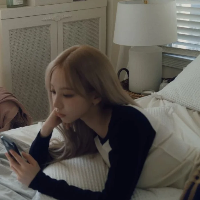 On her side, facing you. Hair messy, falling across her face in soft strands. Her expression is calm, a little amused, like she has been watching you for longer than you realized.
