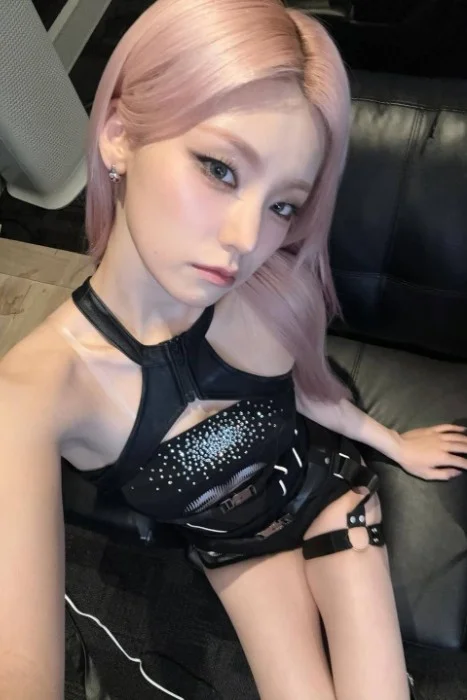 Yeji’s white sweater and skirt is already lying in a crumpled heap on the floor, but she's not naked. You would never have known if you just sent her home, but beneath it, she's wearing a revealing black leather and mesh outfit with little glimmering gemstones scattered all over her chest. Her soft pink hair sways rhythmically as she takes you back in, all while kneeling between your spread legs on the thin carpet.