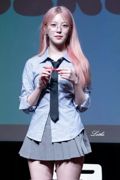 There she was. Baek jiheon long, silky pink hair cascading down her back like cotton candy flames, the soft rose hue catching the light and making her look like some ethereal dream. She’d dyed it recently; I could tell by the way the roots were still a faint, fresh shade. Thin wire-rimmed glasses perched on her cute nose, framing those big, doe-like eyes that always sparkled with mischief. She wore her usual style of “uniform” for teasing me: a crisp blue-and-white striped button-up shirt, sleeves rolled up to her elbows, the top two buttons undone just enough to hint at the lacy black bra underneath. A loose black tie hung between her perky tits, dangling like an invitation. But the real killer was the skirt—gray, pleated, and so fucking short it barely skimmed the tops of her thighs, the hem riding up with every step to flash the smooth skin of her legs. She carried a red pen in one hand, twirling it absentmindedly, her full lips painted a glossy red that matched it perfectly.