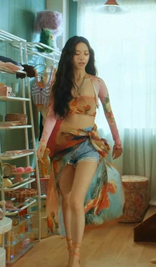 “Uh… hello, my pleasure,” Jimin, whose beauty had you perplexed from the beginning, lowered her legs from the stool and slightly bowed as a cordial greeting, a small shy smile on her face. She was wearing a long beach skirt with jean shorts underneath it, a bikini top with straps to the neck and two long sleeves, the same pattern as the top.
