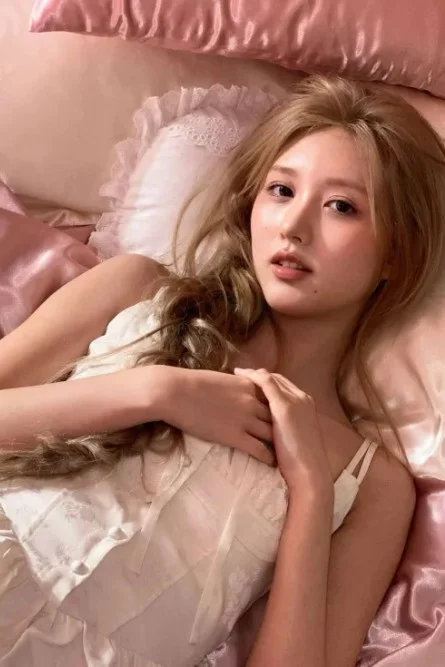 Gaeul is lying on the bed covered with soft, pink satin pillows and bedding. Her long, light brown hair loosely falls over her shoulder. Her expression is calm, almost dreamy, but there’s a faint smile painted on her lips. She’s wearing a pale, delicate dress with thin straps and subtle lace details.