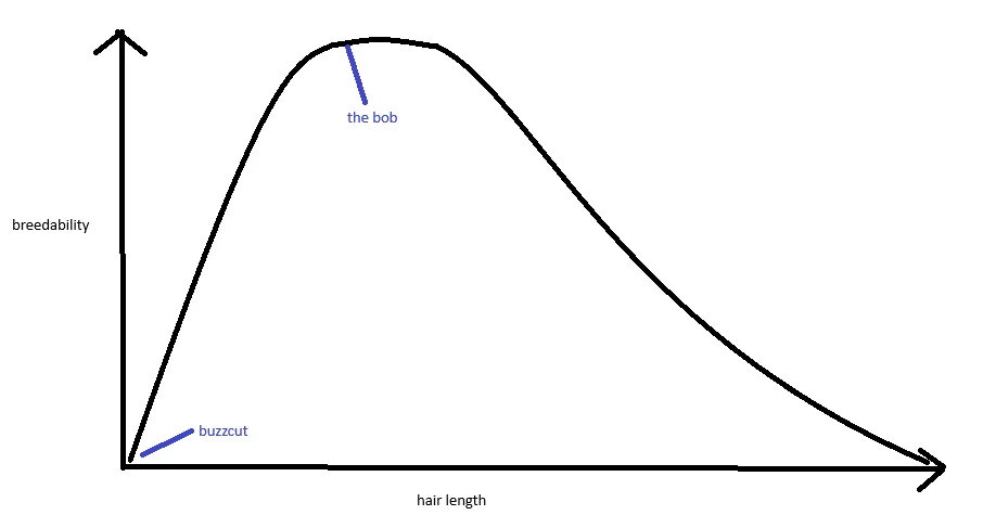 prael: Of course, like most things, the extremes tend to deviate from the pattern, and as hair gets excessively short, we tend to see a reduction in breedability. As proposed by Broc (2026) we see a bell curve effect at the extremes of hair length. An example by Notions (2026) serves to illustrate a lack of breedability buff when hair length reaches a buzzcut.