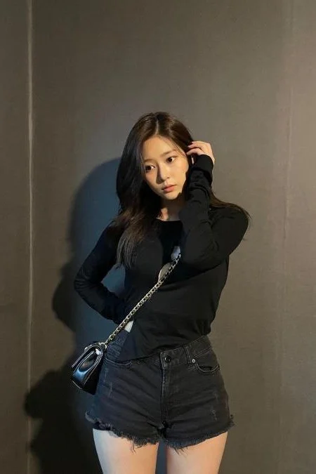 But your main focus definitely lies on her lower body. She is wearing black denim high waist hotpants, which show off her small waist and wide hips. Especially her thighs. Oh my god, her thighs. They look nice and full as always. They jiggle slightly as she walks out of the door.