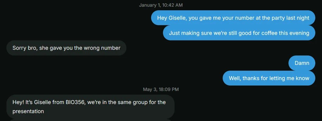 Hey Giselle, you gave me your number at the party last night