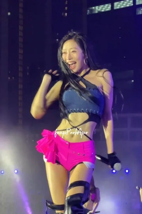 Julie’s chest heaved under the blue-black harness top, the metal rings and criss-cross straps now slick and shining. Pink micro-shorts rode high on her hips, the ruffled hem darkened with water, outlining every line of her toned thighs. She lifted the mic one last time, voice husky from the performance. “Bangkok… you made us feel alive tonight. Thank you!” Her Korean-English mix drew another thunderous cheer, but her smile was already fracturing at the edges—something hotter, needier, flickering behind her leader mask.
