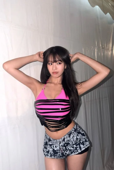 Haneul, the tallest of them, stood near the fan, ponytail loosened and dripping down her back. The black long-sleeve crop with its strategic cut-outs clung to her narrow waist, the pink panels darkened and slick. Her micro-shorts had ridden up during the water fight on stage, exposing the smooth underside of her long, toned thighs and the subtle curve where her ass met her legs. She lifted one leg experimentally, boot still on, stretching the muscle with a quiet hiss. “Unnies… I think I’m still shaking,” she admitted, voice soft but edged with something new—less maknae hesitation, more raw hunger. Her fingers brushed the hem of her shorts, pulling the wet fabric away from her skin only for it to snap back with a quiet, obscene sound.